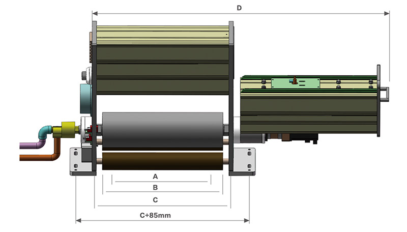 型号 | 处理宽度A | 辊面宽度B | 中心安装宽度C | 放电站+抽出总宽D |